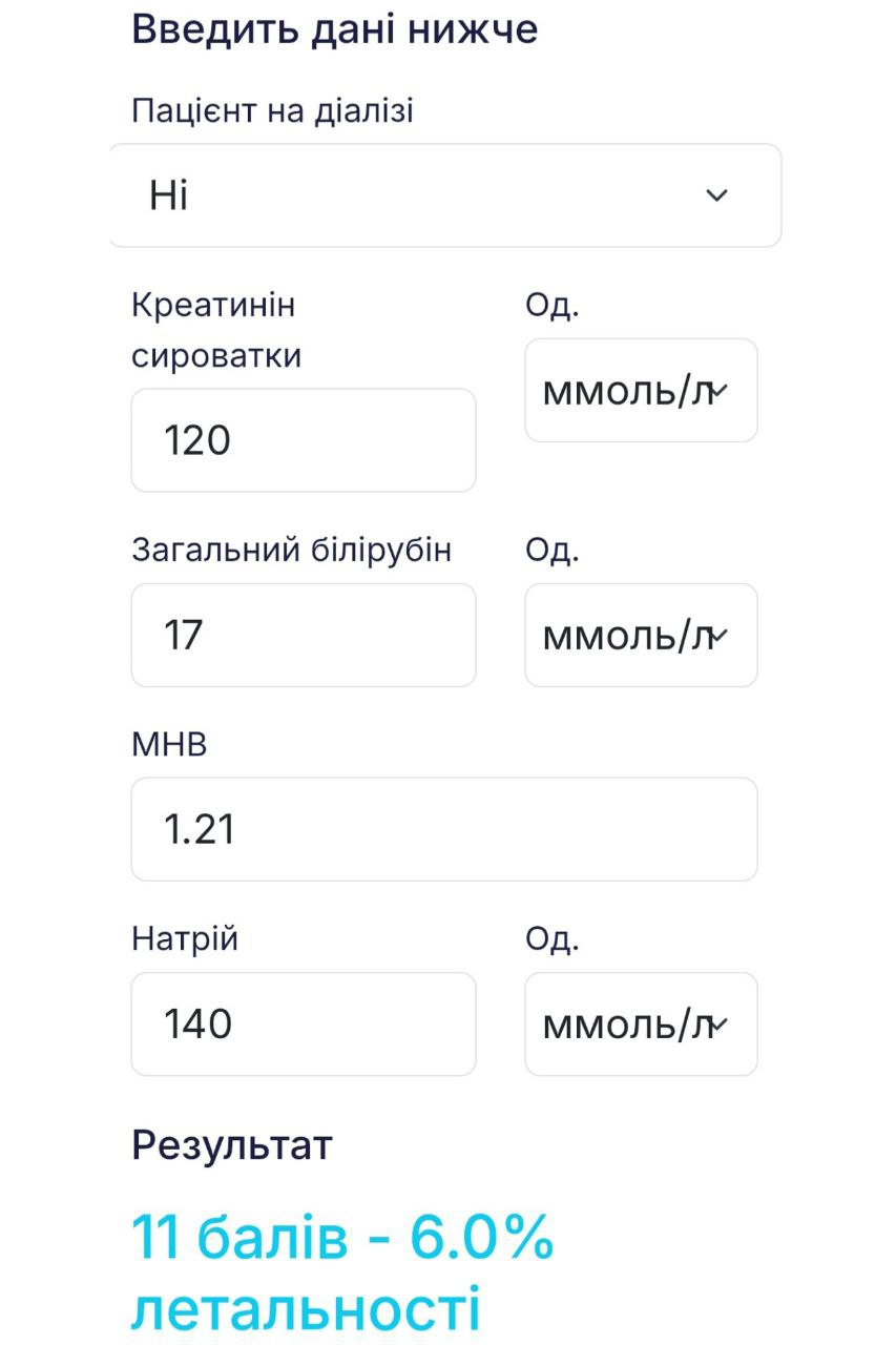 Базовий прогнозуючий інструмент для пацієнтів із цирозом та у програмі трансплантації печінки. Параметри: INR, загальний білірубін, сироватковий креатинін